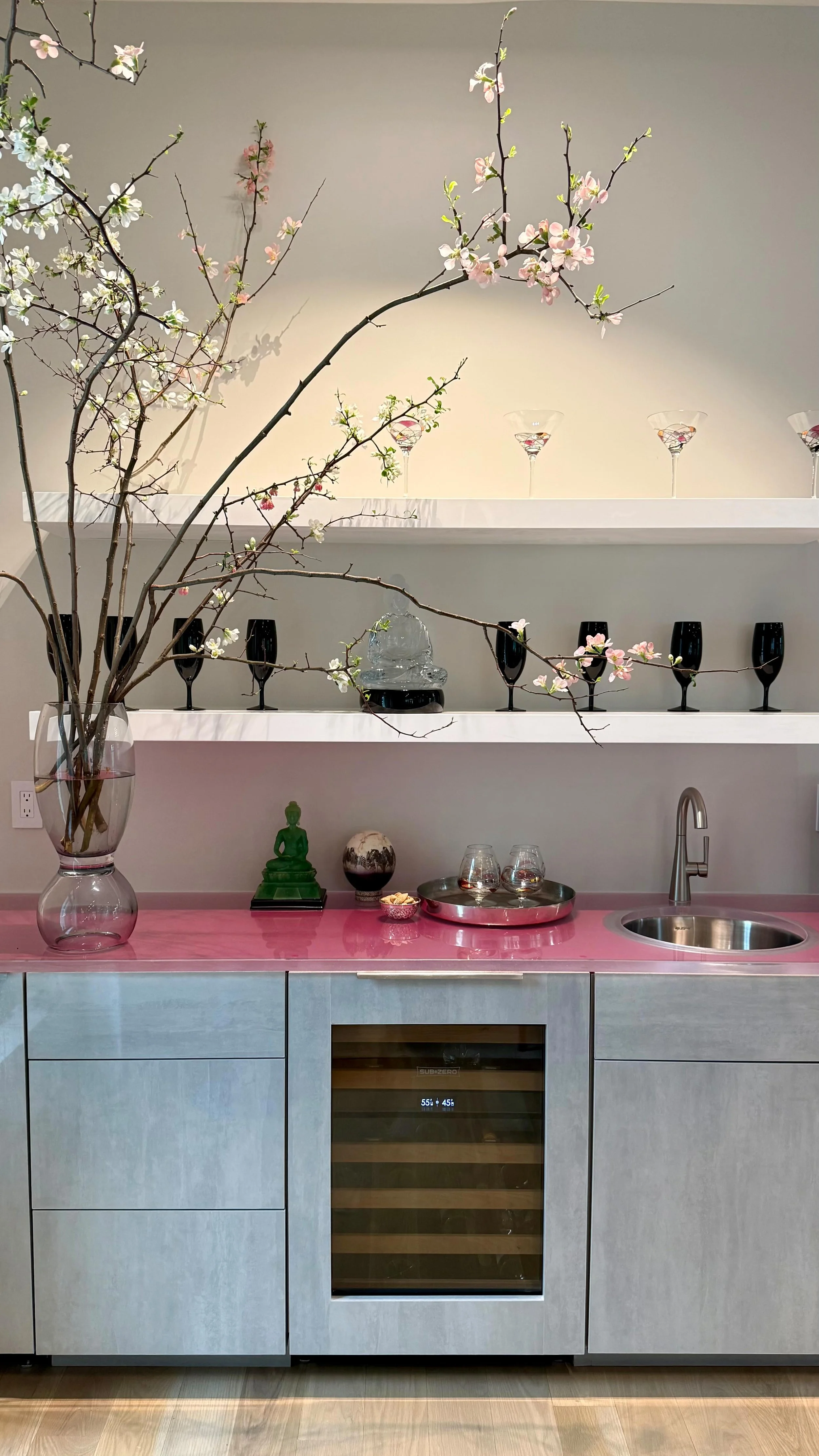 Interior design magazine layout featuring six different rooms. Images include a blue bookshelf with decor, an entrance with wooden cabinet, a dining area with beige seating and a dog, a modern bedroom with magazine covers, a bedroom with colorful accents, and a living room with patterned curtains and cozy seating. Text highlights "Silver Linings" about a home renovation post-house fire.