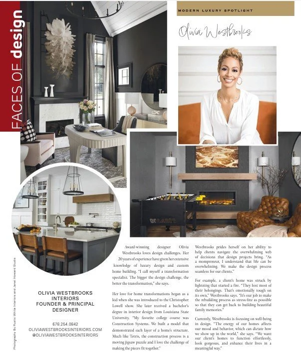 Interior design magazine page featuring Olivia Westbrooks, her photo, and images of modern interior spaces with dark accents, elegant furnishings, and a stylish kitchen. "Faces of Design" section includes text about Olivia Westbrooks Interiors.