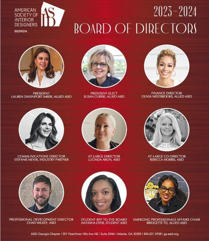 American Society of Interior Designers Georgia 2023-2024 Board of Directors poster featuring 9 members with profile photos and titles.